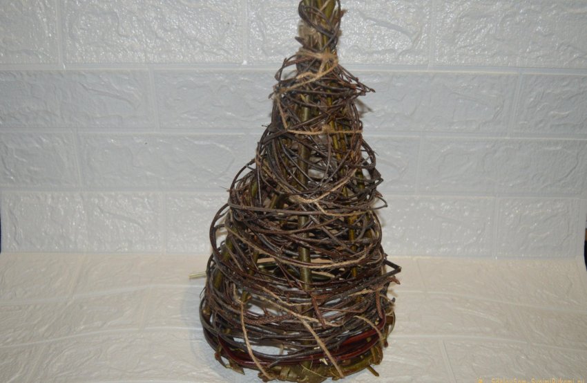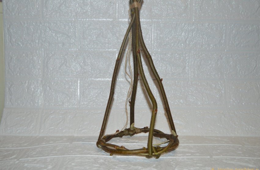 3. Каркас обматываем тонкими ветками. Чтобы прутья надежно держались, окручиваем изделие шпагатом.