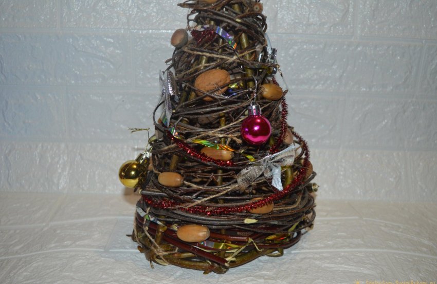 5. Сверху вешаем бант, внутрь елки отправляем гирлянду.