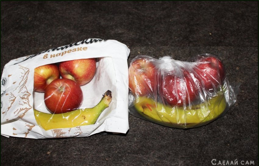Теперь по совету домашних мастеров и мастериц-бананы нужно положить на хранение с яблоками.