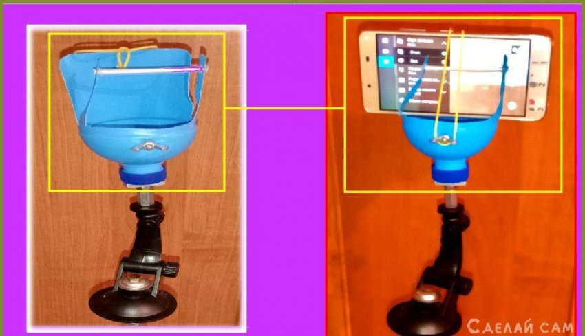 В качестве которой представлен вариант держателя смартфона, изготовленного из обычного флакона бутыли от бытового средства. Следует отметить, что оно предназначено для с смартфона с боковым расположением камеры, которая устанавливается в пазу флакона и фиксируется там с помощью резинки. Для нее на одной сттороне проделано отверстие, а на другой установлен болт с барашком, на который она накидывается при фиксации смартфона.