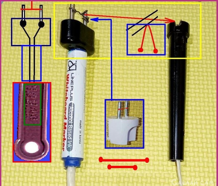 1. Для этого подошел корпус фломастера и старая вилка, которая плотно насаживается на него. Провода проходят внутри корпуса и припаиваются внутри вилки к ее штырям.