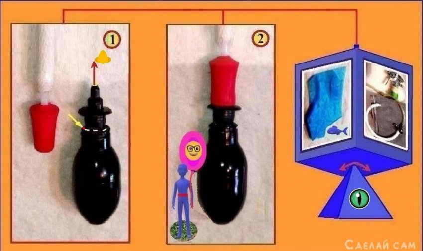 От отслужившем свой срок аппарате для измерения давления остается работоспособным помповый механизм, который можно использовать автономно для выполнения той же функции - нагнетания воздуха в шарики или продувки резиновых перчаток, а надувной резиновый мешок - в качестве ресивера для распылителей (3).