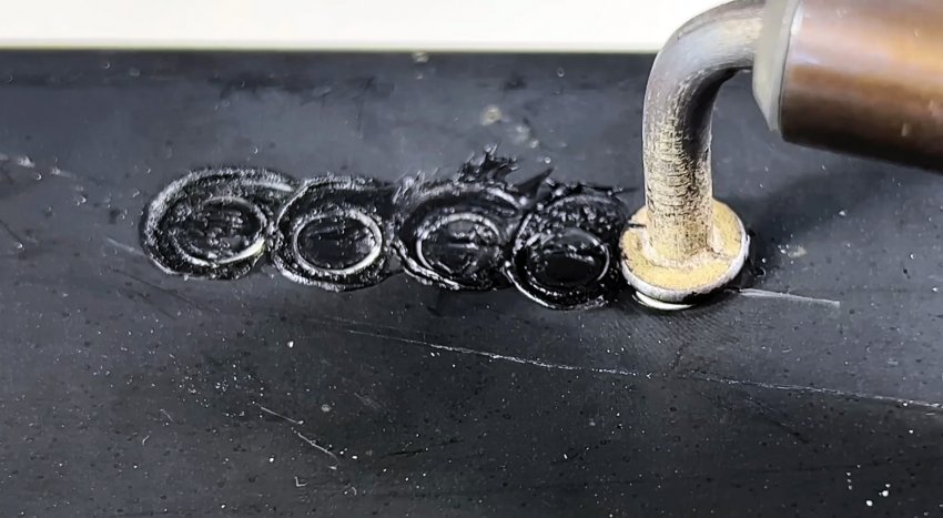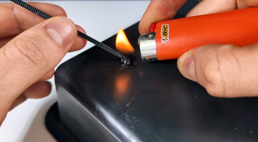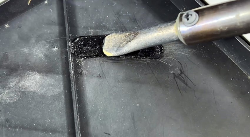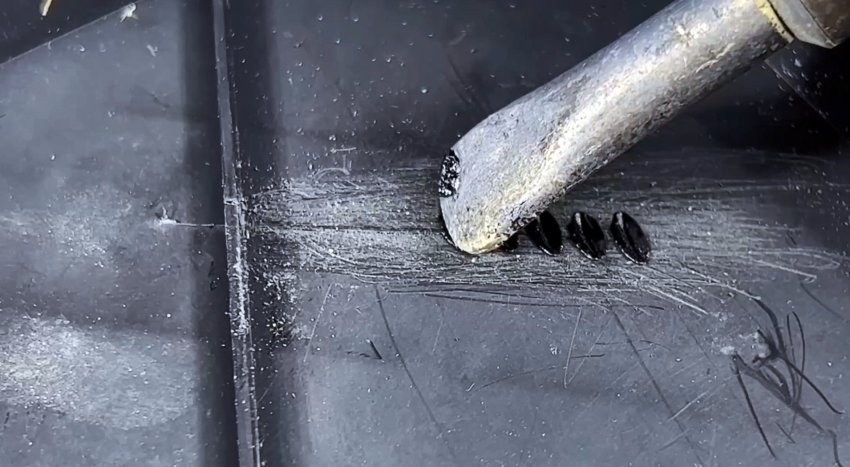 Тыльную сторону трещины зачищаем наждачкой и нагретой медной трубкой выполняем серию поперечных расплавленных полосок, которые заливаем жидким пластиком, расплавляя пластиковый хомут. Снимаем алюминиевую фольгу, и трещина надежно заделана.