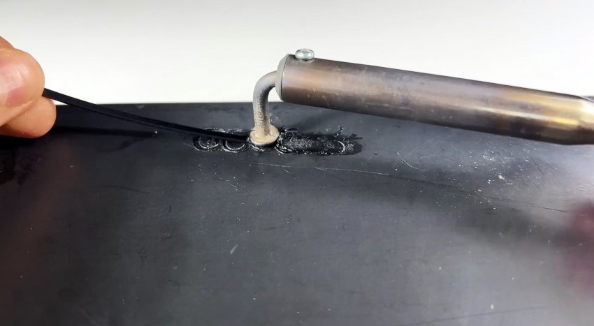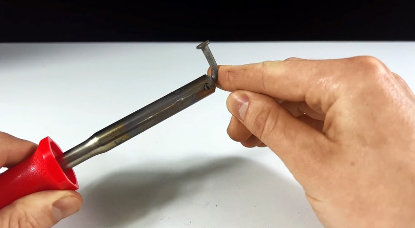 Для заделки сквозной трещины используем гвоздь, изогнутый под 90 градусов, и закрепленный в паяльнике.