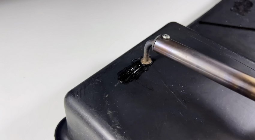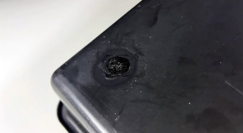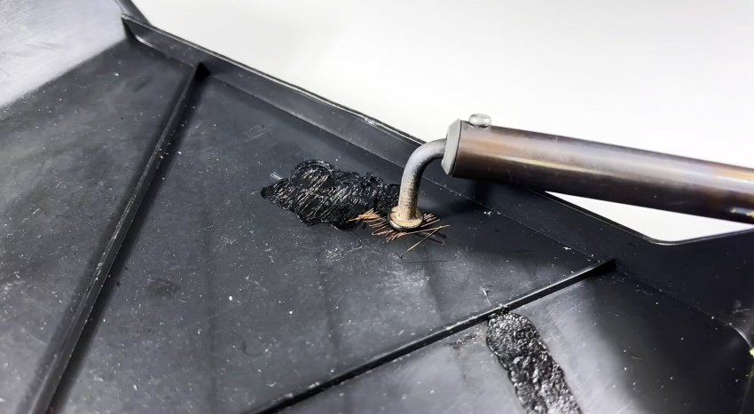 На перфорацию с лицевой стороны помещаем кусок клейкой алюминиевой фольги, а с тыльной стороны дефект заливаем жидким пластиком, расплавляя часть пластикового хомута.