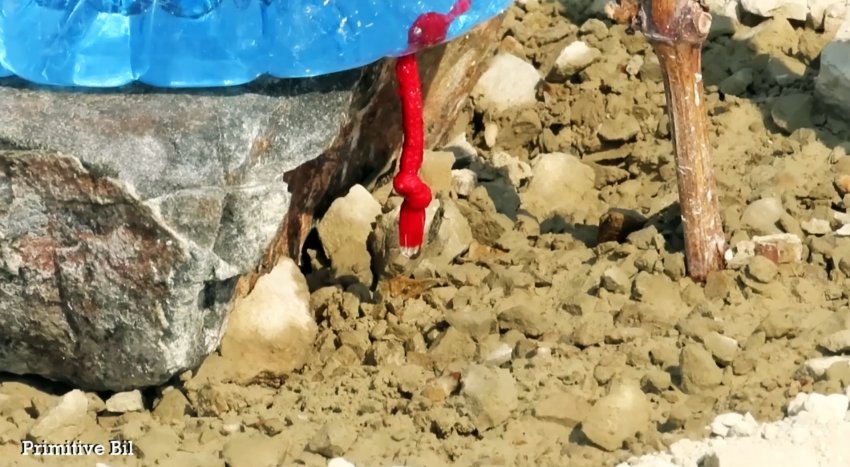 Устанавливаем бутылку на подходящий предмет типа плоского камня или кирпича так, чтобы шнурок располагался над корневой системой орошаемого растения. Откручиваем крышку бутылки и через воронку заполняем емкость поливной водой.