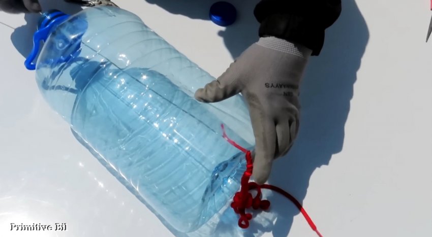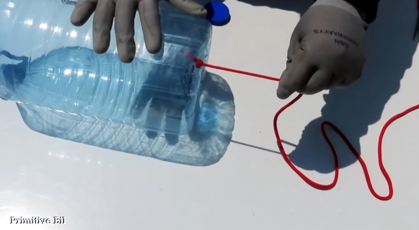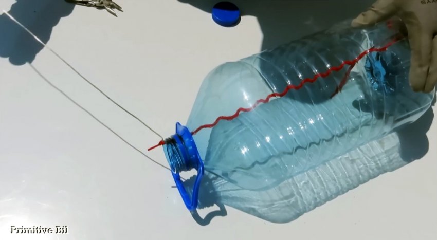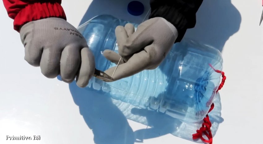 Затем проволочным крючком вытягиваем шнурок из горлышка бутылки и завязываем на конце простой узел, чтобы шнурок не мог выпасть наружу.