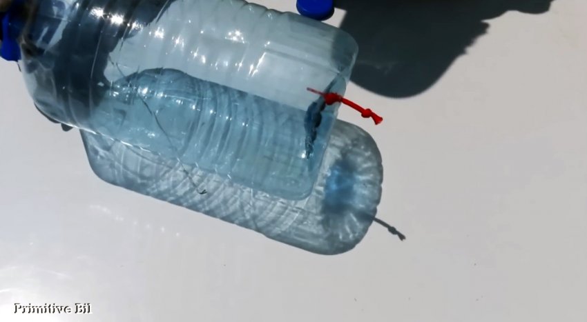 В крышке протыкаем небольшое отверстие для поступления воздуха по мере опустошения бутылки и закручиваем ею горлышко бутылки.