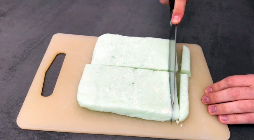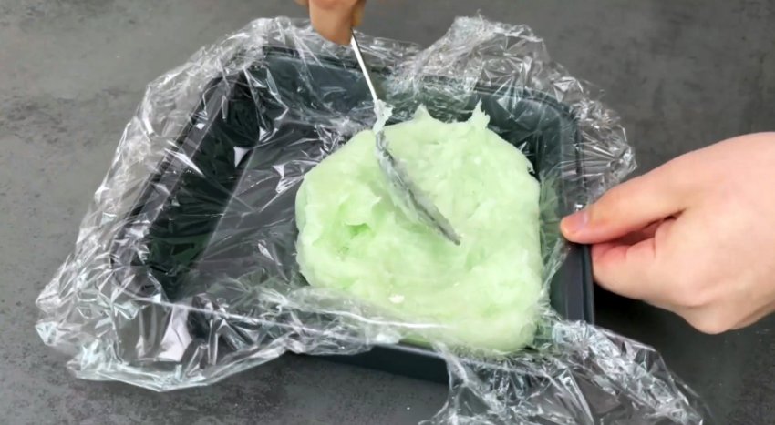 Это приобретенное свойство сигнализирует о том, что ингредиенты полностью вступили в соединение друг с другом и кастрюлю можно снимать с огня. Выкладываем полученную массу в форму, предварительно застелив ее пищевой пленкой.