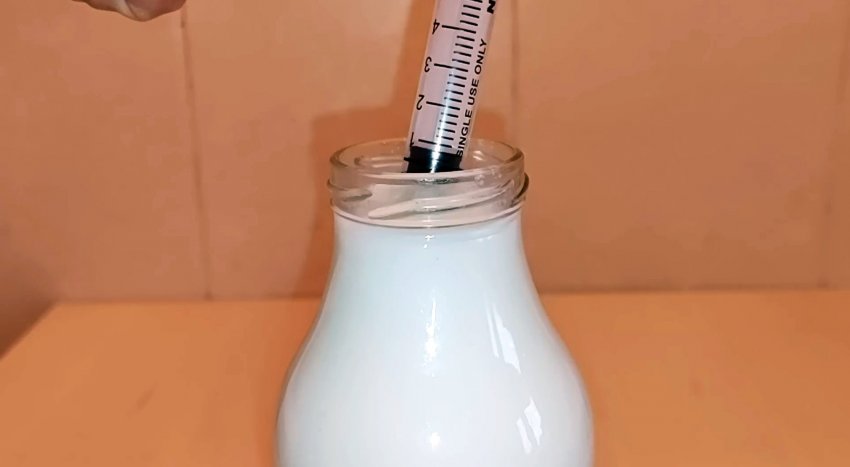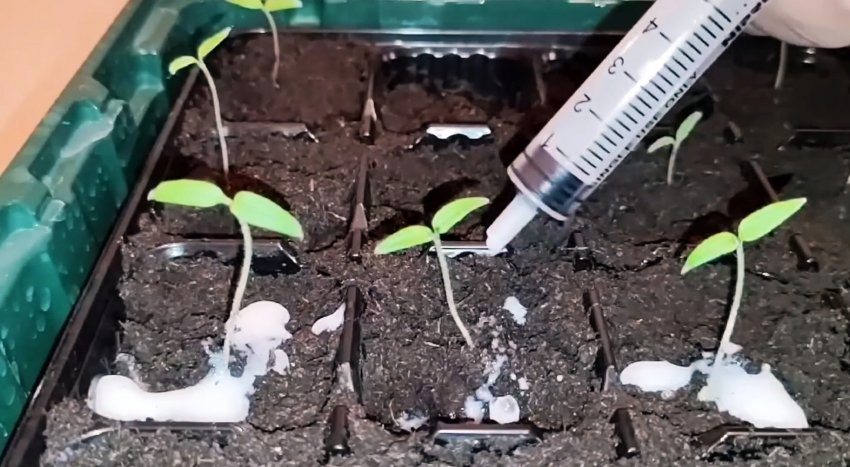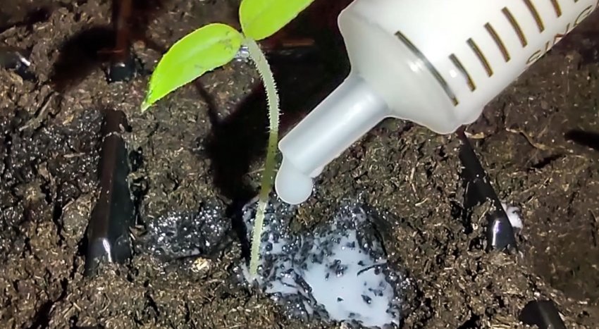 Затем шприцем капаем молочную подкормку на корни растений или распыляем на листья.