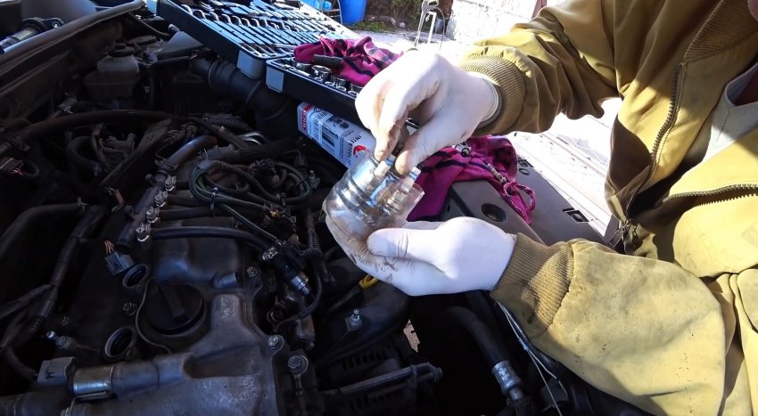 Утром вновь выкручиваем свечи зажигания и вытягиваем подходящим по объему медицинским шприцем залитую накануне жидкость в небольшую прозрачную емкость.