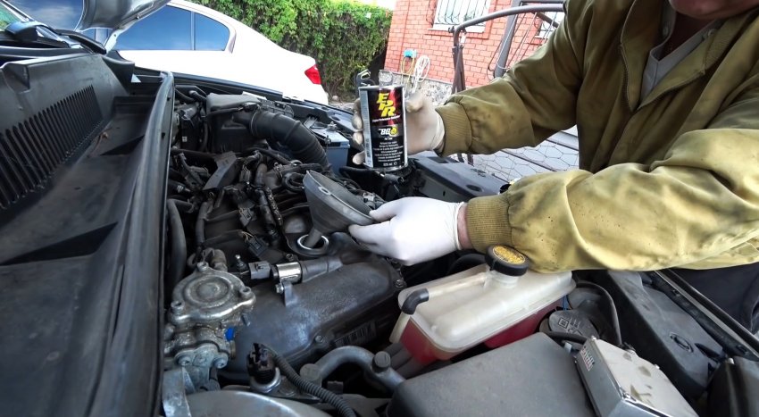 Чтобы раскоксовать двигатель, понадобятся две жидкости, одна для заливки непосредственно в моторное масло, другая – в цилиндры двигателя. Для этого открываем горловину на крышке головки блока цилиндров и, пользуясь воронкой, заливаем содержимое первой баночки.