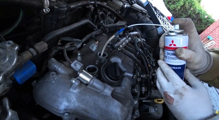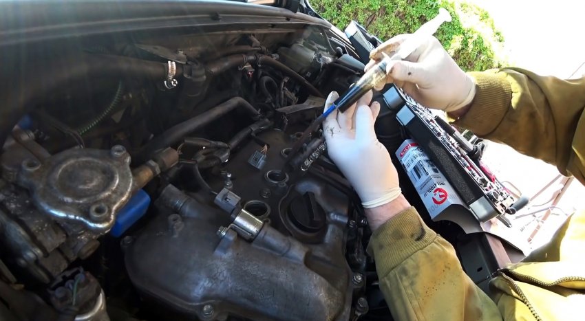 Выставляем поршни в цилиндрах по высоте примерно на одном уровне, используя любую металлическую спицу и равномерно заполняем каждую камеру сгорания вторым средством через самодельный удлинитель из шланга. Закручиваем, но не затягиваем свечи, и оставляем на ночь.