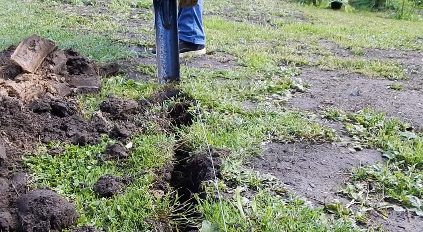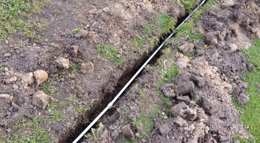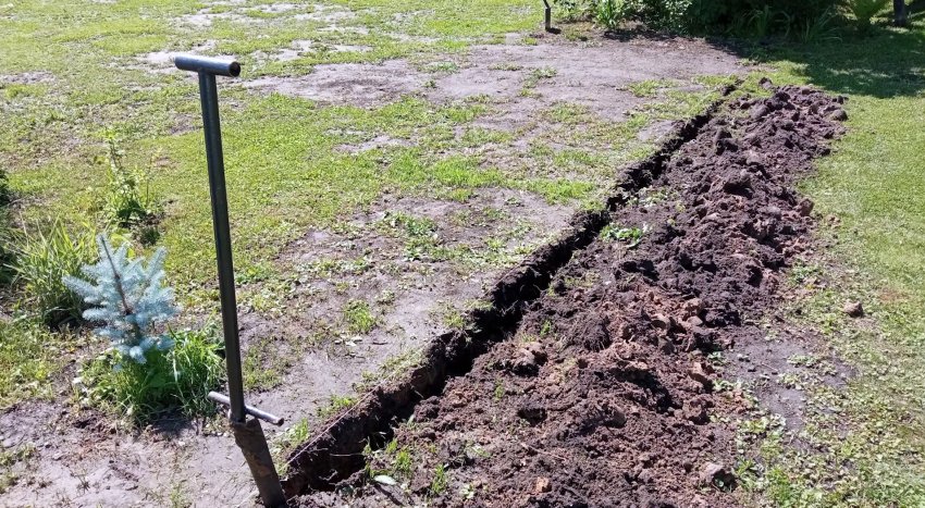 Копать такой лопатой совсем не сложно, довольно легко, но процесс получается немного замедленным. Примерно за 1 час можно выкопать траншею длиной около 35 метров, что вполне не плохо для ручной работы. В траншею укладываем пластиковую трубу и засыпаем землей.