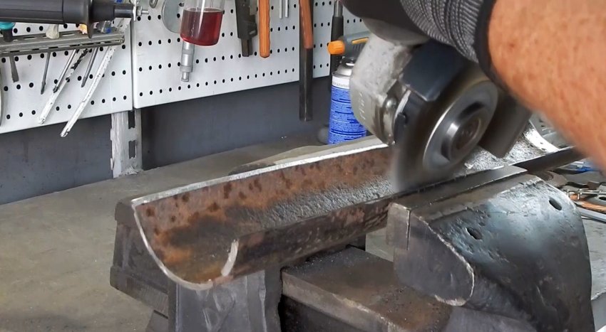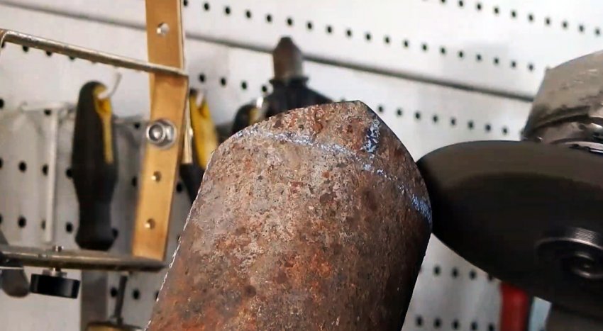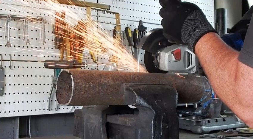 Конец лопаты заостряем, чтобы было легче вкапываться в землю и перерезать встречающиеся в почве корни. По размеченным линиям болгаркой вырезаем контуры лезвия и наконечник лопаты. С помощью зачистного круга выравниваем линии реза и делаем заточку лопаты изнутри. Обдирочным диском удаляем старую ржавчину и грязь с поверхности трубных заготовок.