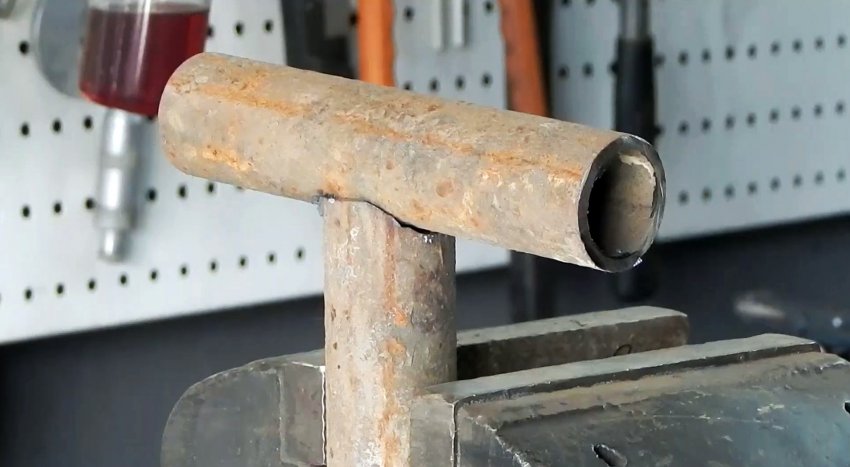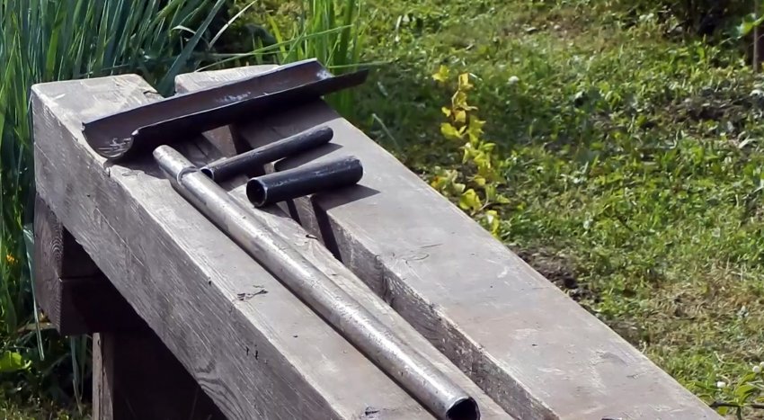 Из трубы диаметром 16 мм вырезаем опору для ноги. Также отрезаем черенок для лопаты и готовим наши детали к сварке. Сначала их соединяем прихватками, затем убедившись, что все получилось правильно, свариваем окончательно.