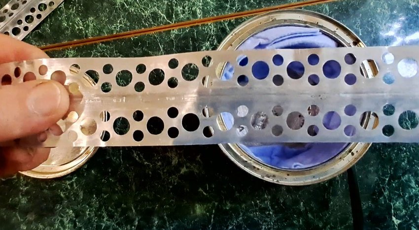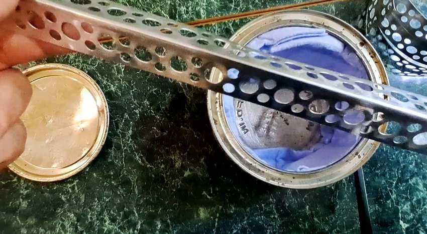 Для фиксации и прижатия фитиля к стенкам банки используем перфорированную упругую металлическую полоску или сетку, свернутую в кольцо, а также навитую из проволоки пружину, диаметр которой несколько больше диаметра банки.