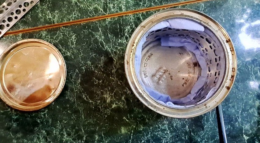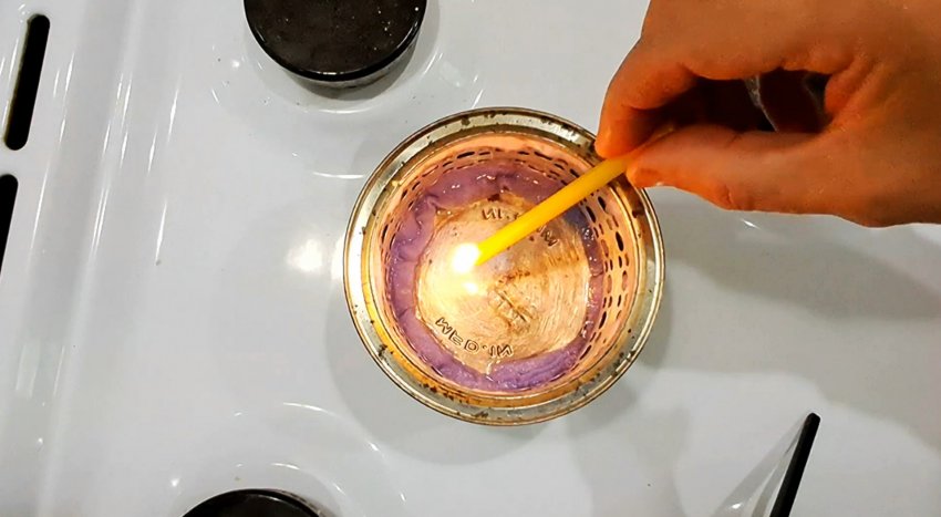 Опыт показывает, что для равномерного горения, банку следует слегка встряхнуть, чтобы фитиль был полностью смочен. Для того, чтобы потушить нашу горелку, достаточно прикрыть ее старой тряпкой или несколько большей по размерам емкостью.