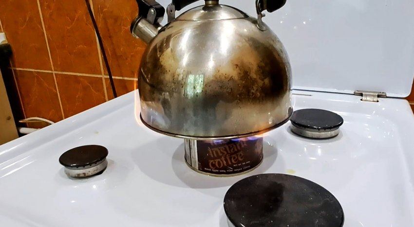 Наливаем в банку горючее, объем которого должен покрывать дно, и поджигаем его. Даем время для прогрева стенок и закрываем крышку. Поджигаем выходящие из отверстий пары горючего, ставим на банку чайник с водой, кастрюлю с продуктами и одновременно обогреваем помещение.