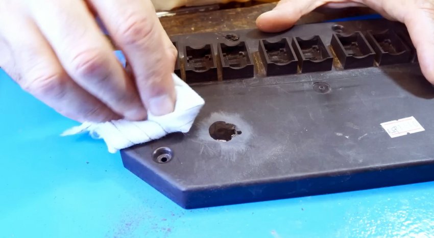 Шлифуем место заливки 600-й наждачной бумагой, удаляем кисточкой продукты шлифовки и на место ремонта наносим немного масла, например технического вазелина, который растираем тканевой салфеткой по месту ремонта.
