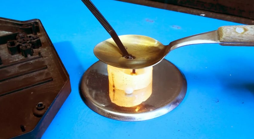 На огне восковой свечи разогреваем металлическую столовую ложку и в ней расплавляем некоторую часть пластикового хомутика.