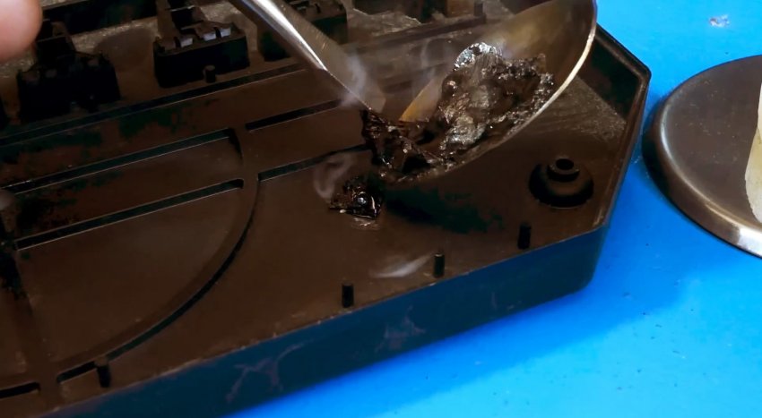 После того как жидкая пластиковая масса остыла и затвердела, удаляем с лицевой стороны липкую ленту и алюминиевую фольгу. Разогреваем конец плоской отвертки над огнем свечи и разглаживаем застывшую пластиковую массу с лицевой стороны.
