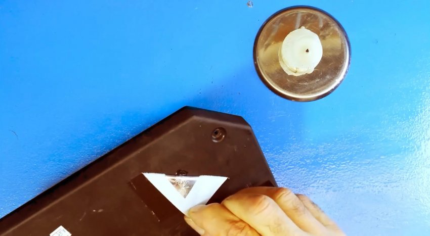 С лицевой стороны пластмассовой детали сквозное отверстие прикрываем кусочком алюминиевой фольги, размеры которой заведомо больше образовавшейся сквозной пробоины. Фиксируем фольгу на отверстии с помощью липкой ленты.