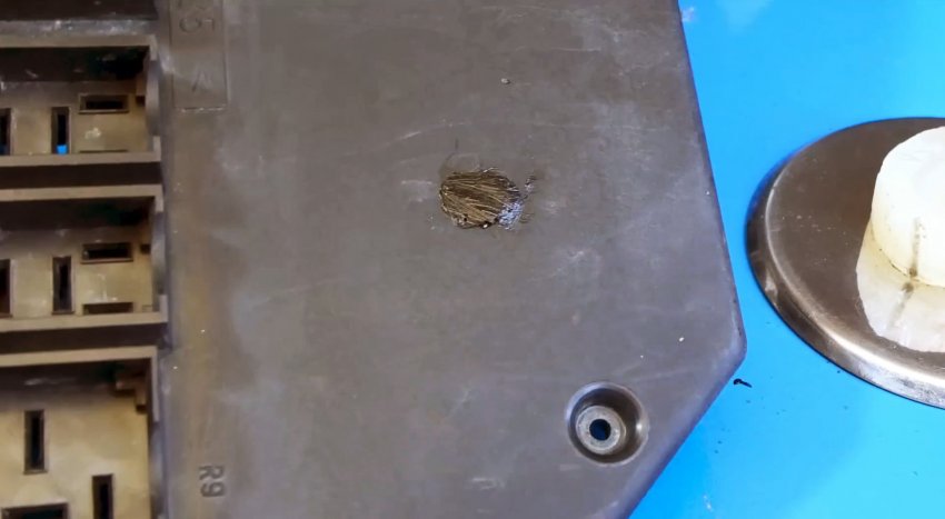 Полученной расплавленной массой заполняем с тыльной стороны полость отверстия в пластмассовой детали.