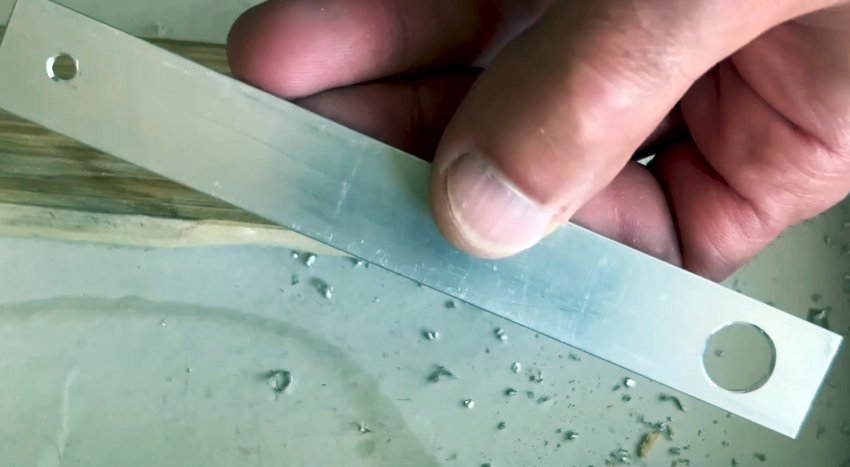 На краях заготовки по срединной линии намечаем центры и сверлим отверстия, отступив от одного конца 1 см, диаметром 0,4 см, а от другого – 1,5 см и диаметром 1,2 см.