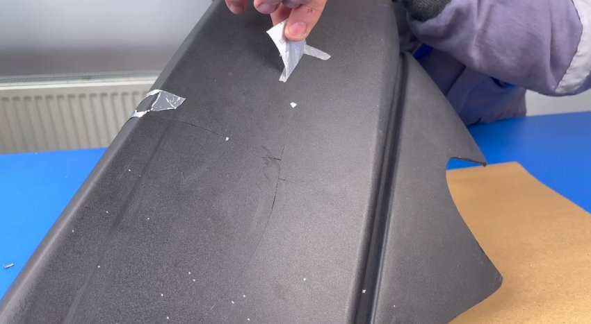 Фиксируем место повреждения с лицевой стороны алюминиевым скотчем, приклеивая его по трещинам.