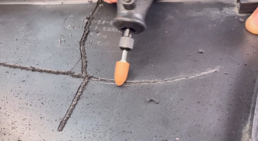 Расшиваем и шлифуем с изнанки трещины подходящей фрезой и шлифовальным камнем.