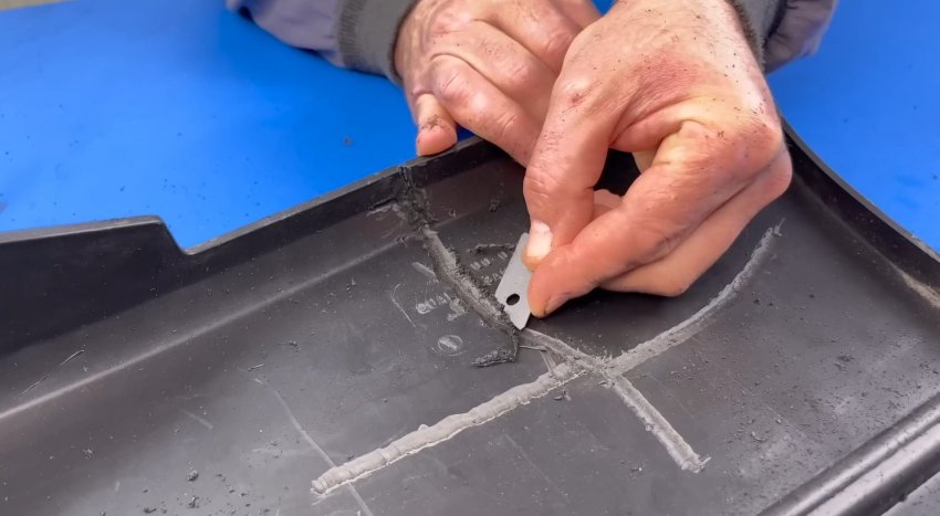 Пластиковую стружку удаляем лезвием ножа и протираем место повреждения чистой салфеткой.