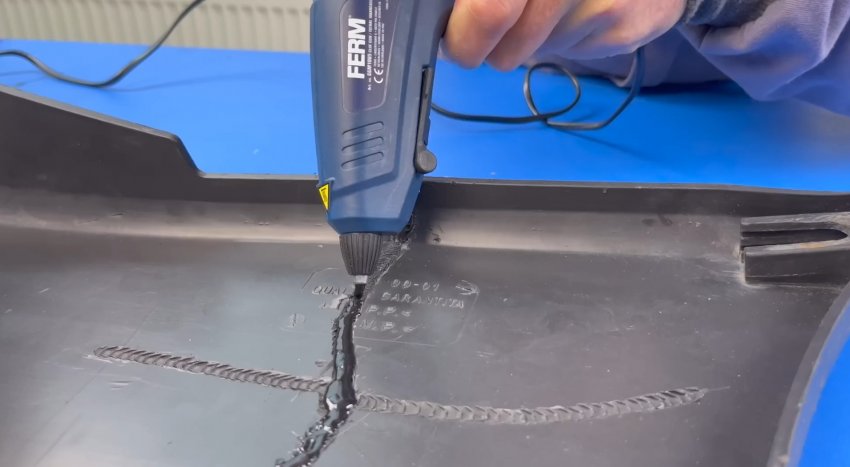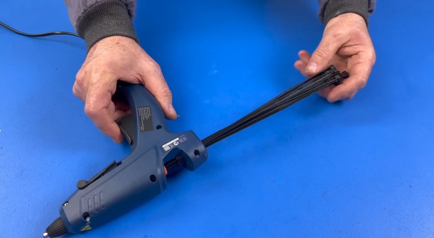 Откусываем у кабельных стяжек концы и, заправив ими клеевой пистолет, заполняем углубления по трещинам расплавленным пластиком.