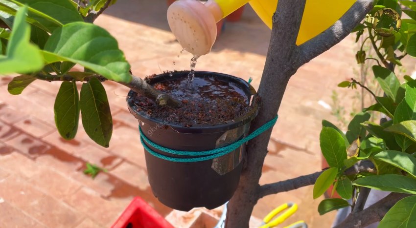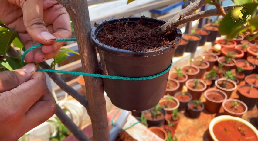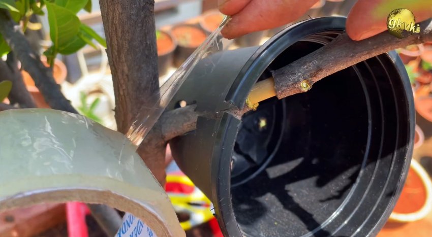 Сначала подготавливаем на ветке надрез или снимаем кору, в зависимости от того с каким растением работаем. Далее надеваем на ветку горшок, разрезанный с одной стороны вдоль.