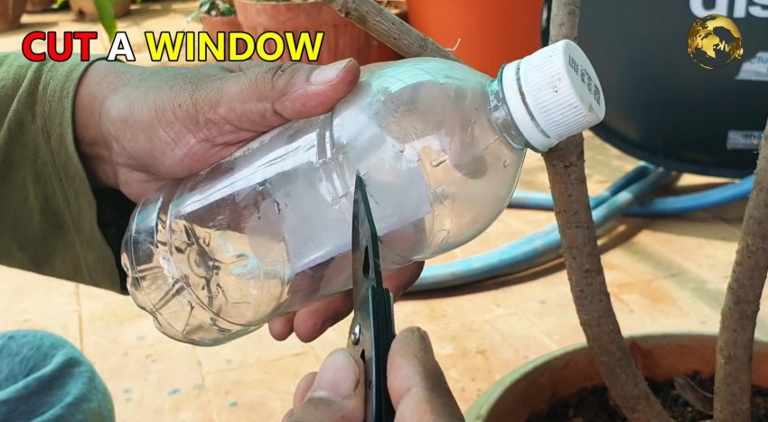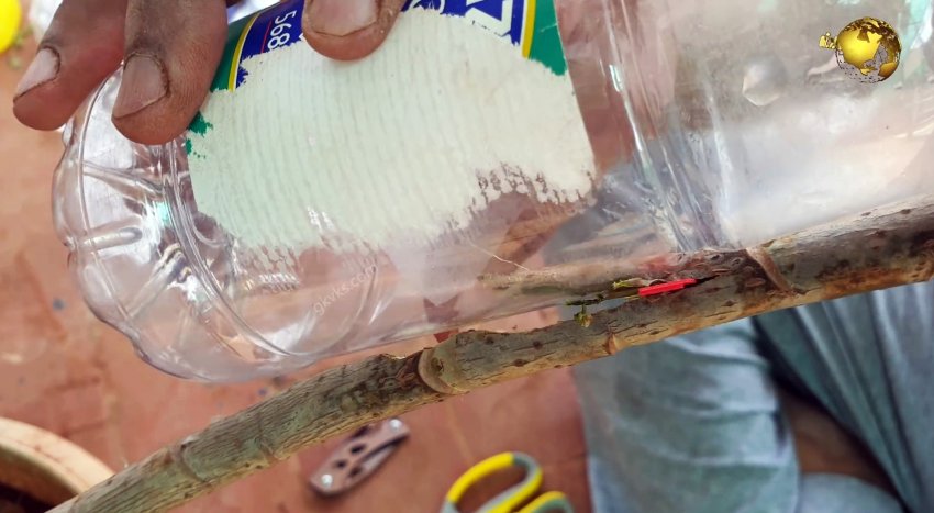 Тоже можно сделать косой срез на ветке, чтобы получить длинную щепку. Далее берем ПЭТ бутылку, и сбоку прорезаем в ней отверстие. В него вставляем щепку.
