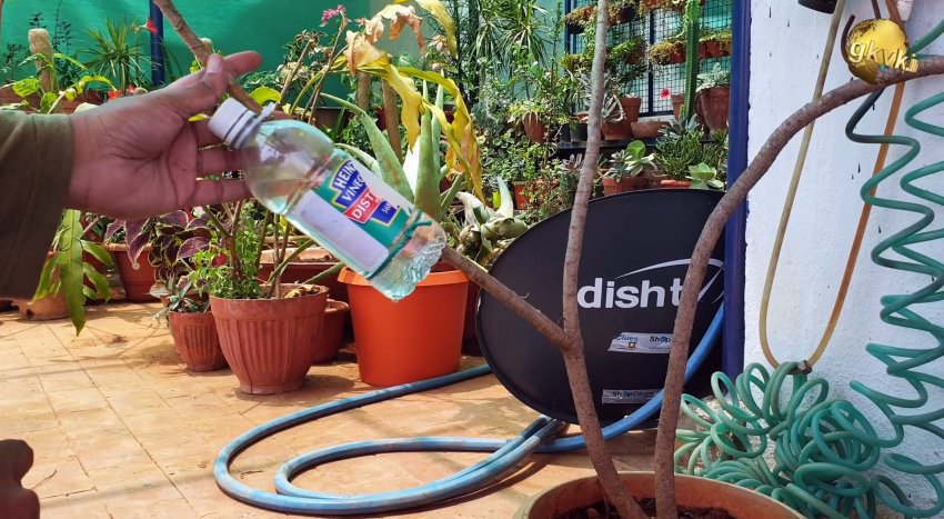 Затем заполняем бутылку водой так, чтобы закрыть щепку. Привяжите бутылку, и прикройте чем-то темным. Остается периодически подливать водичку, пока не появится корень. Для ускорения укоренения в воду можно добавить стимулятор роста или четверть таблетки аспирина.