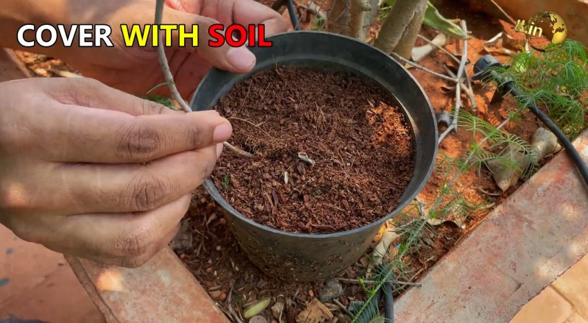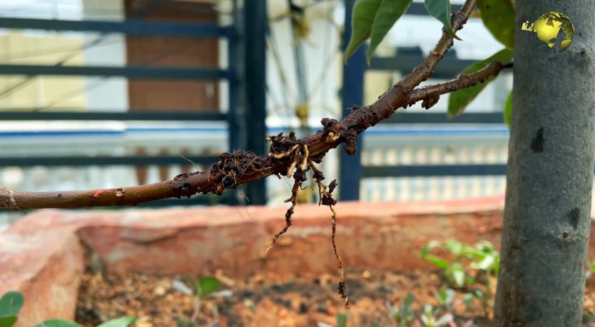 Над землей оставляем верх ветки с листьями. Теперь ждем 4 недели. Обязательно регулярно поливаем отводок в месте срезанной коры. Уже через месяц он даст корешки. Его можно будет отрезать, и высадить в новом месте.
