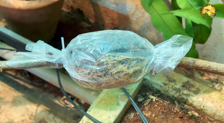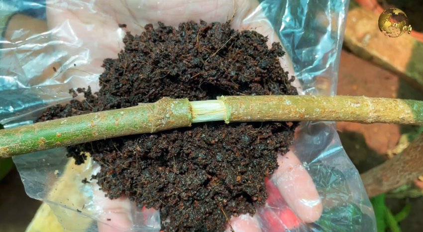 У двудольных растений нужно делать не надрез, а снимать кольцо коры шириной 2 см. Срезается как верхняя грубая кора, так и зеленый камбий под ней. Затем наматывается пакет с субстратом, как и в случае с однодольными растениями. Когда в мешке прорастут корни, ветка отрезается и высаживается отдельно.