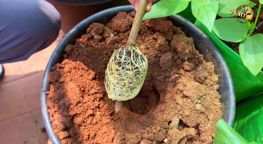 Разрез горшка склеивается скотчем, и подвязывается веревкой. Затем в него засыпается грунт. Таким образом, выращиваем корень как в предыдущем способе. Но здесь грунт придется поливать. Если закрыть горшок пакетом, то это придется делать реже.
