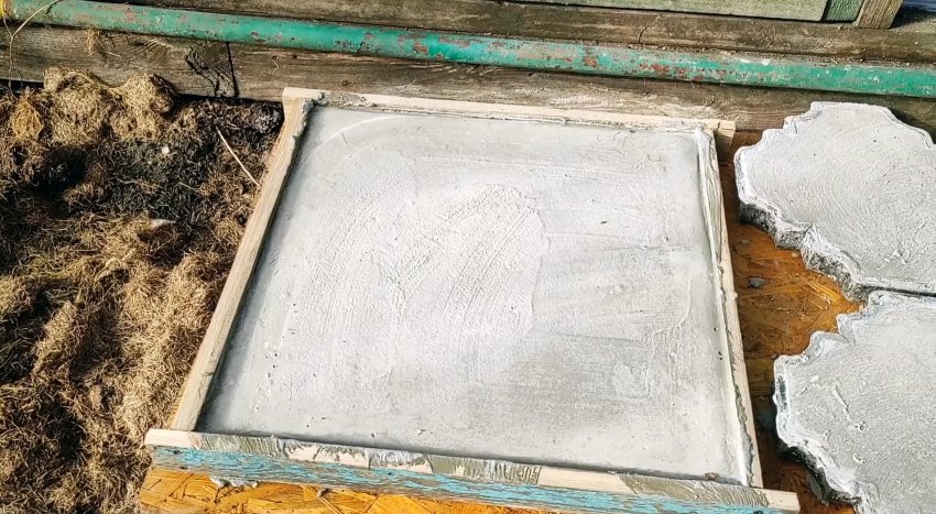 Бывает, что на готовой плитке остается окантовка из наплывов. Пока бетон еще не окончательно затвердел, ее легко убрать шпателем. Также она хорошо сошлифовывается. Вот таким образом можно сделать нужное количество плиток толщиной 50-65 мм, потратив на формы сущие копейки.