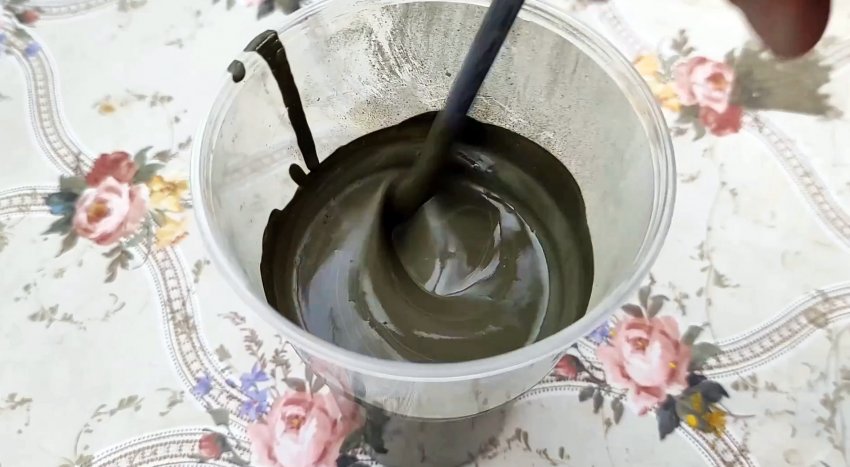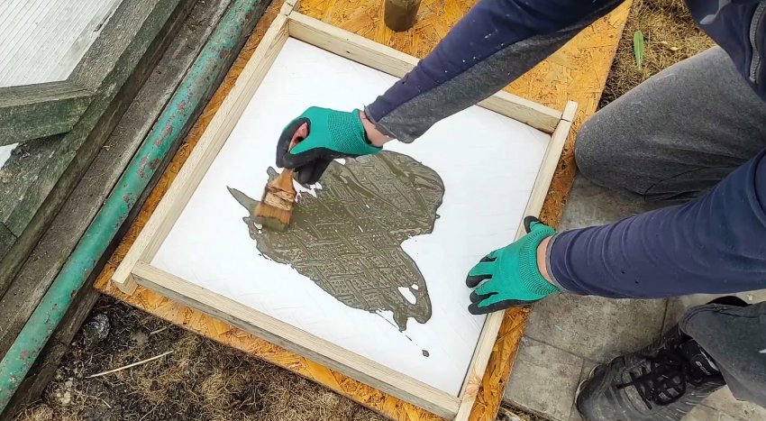 Устанавливаем нашу форму на ровное основание, и заливаем в нее немного раствора цемента с водой. Теперь распределяем его тонким слоем по всей поверхности с помощью кисти.