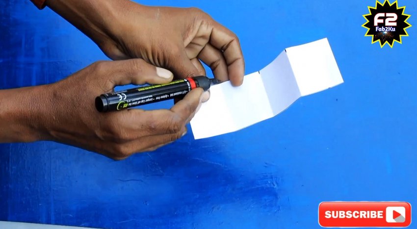 Бумага складывается в длину пополам, а затем еще раз. В результате на ней после разворачивания останется 3 складки. На них нужно поставить метки маркером.