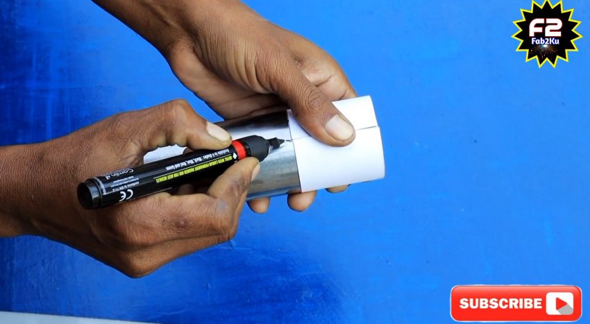 Прямоугольник оборачивается на трубу и выравнивается по ее краю. Далее нужно пометить линию стыка, а также перенести метки с бумаги на торец трубки. С противоположной стороны отмечается только стык.