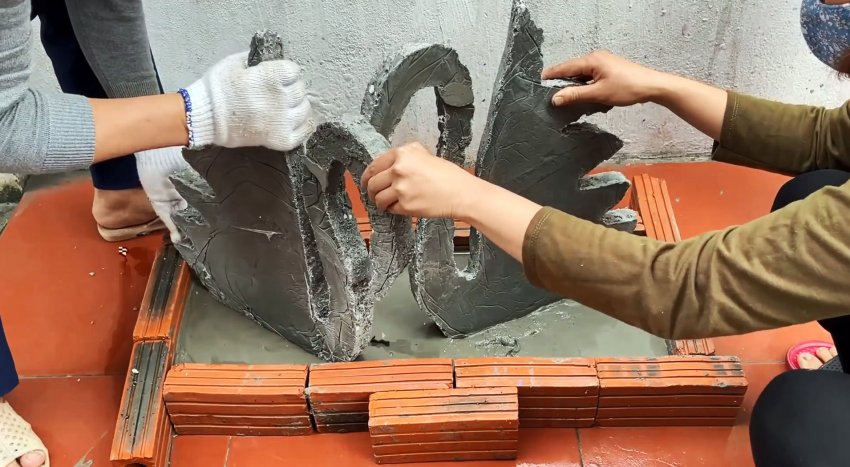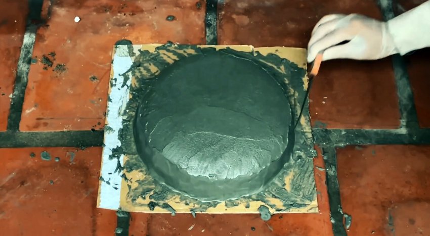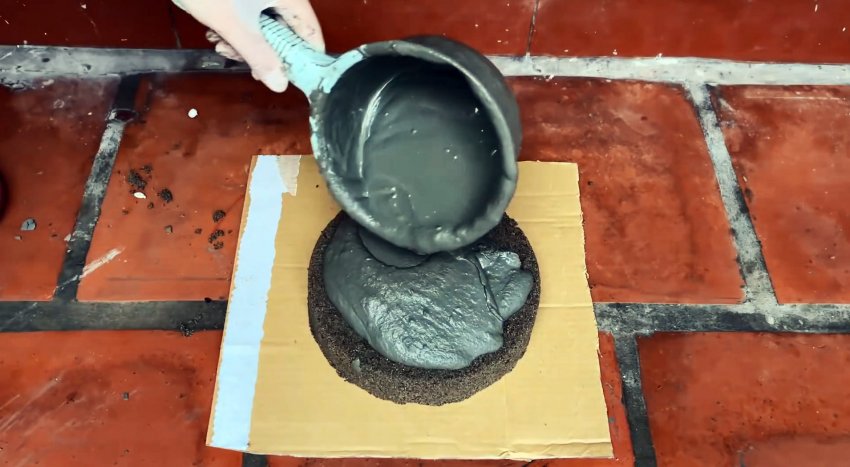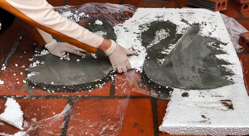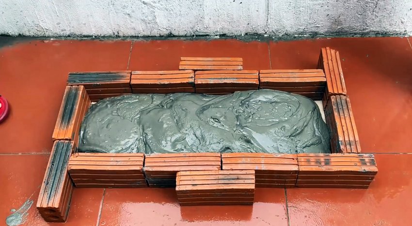 Его можно купить в мешках, или же смешать цемент с песком в пропорции 1:2. Желательно добавить фиброволокно. Тонкие детали опалубки будут всплывать, их нужно прижимать кирпичом.