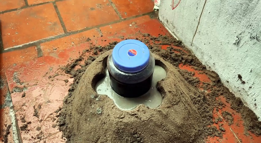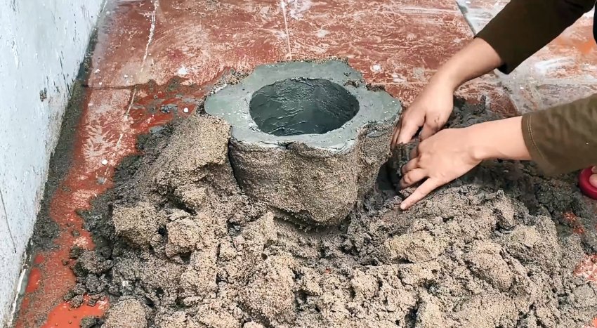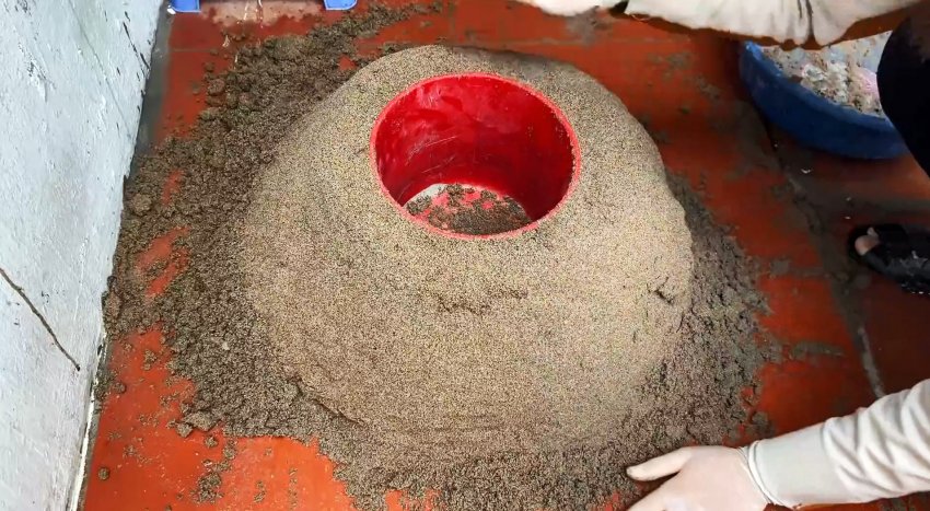 Внутрь песчаной формы заливается жидкий бетон примерно наполовину. Затем в нее погружается утяжеленная водой банка, ведро поменьше или другая емкость, чтобы создать полость для посадки растения.