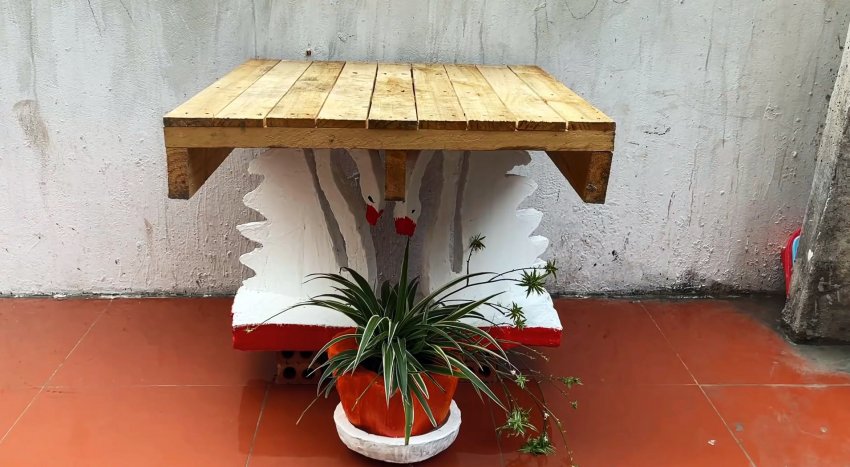 Остается только установить основание, и накрыть его столешницей, сколоченной из деревянного поддона. Горшок лучше ставить на стол. Он прижмет столешницу, чем предотвратит ее опрокидывание, так как она ничем не крепится.