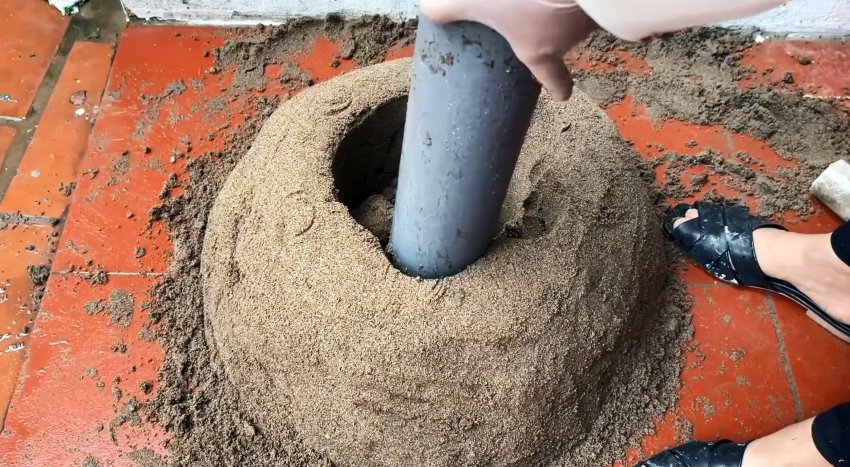 Ведро убирается, и окружность формы разделяется на 5 секторов. Далее нужно по ним срезать песок канализационной трубой под углом, чтобы расширить форму, и сделать ее фигурной. Ее нужно почистить изнутри, и пригладить стенки.