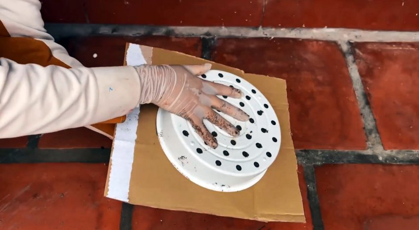 Чтобы сделать поддон под цветочный горшок, нужно утрамбовать влажный песок в тарелку или таз подходящего размера. Затем форма переворачивается, и плотный песок обмазывается сверху бетоном.