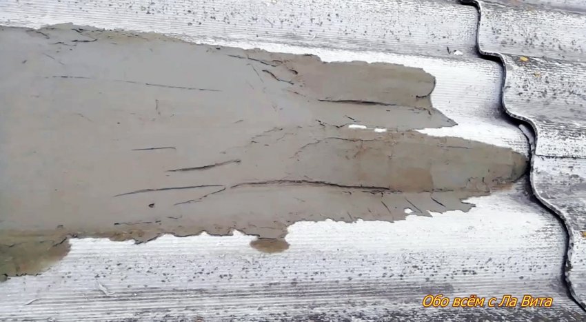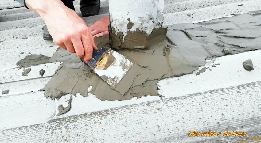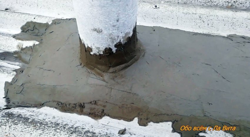 Затем из него необходимо сделать пологий скат, чтобы вода обтекала дымоход и сбегала по соседним волнам кровли.