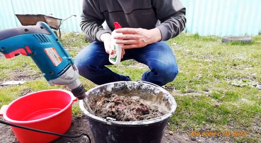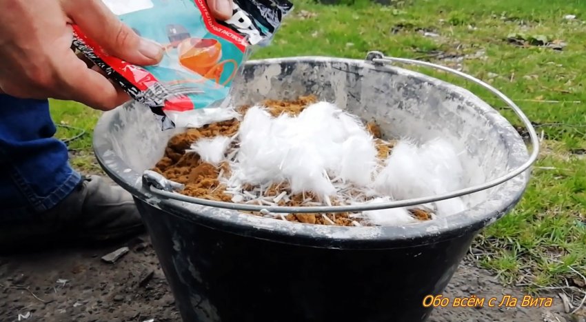 Их нужно перемешать сухими вместе с фиброй. Затем уже добавляться вода и пластификатор. Вместо последнего можно влить немного моющего средства для посуды.